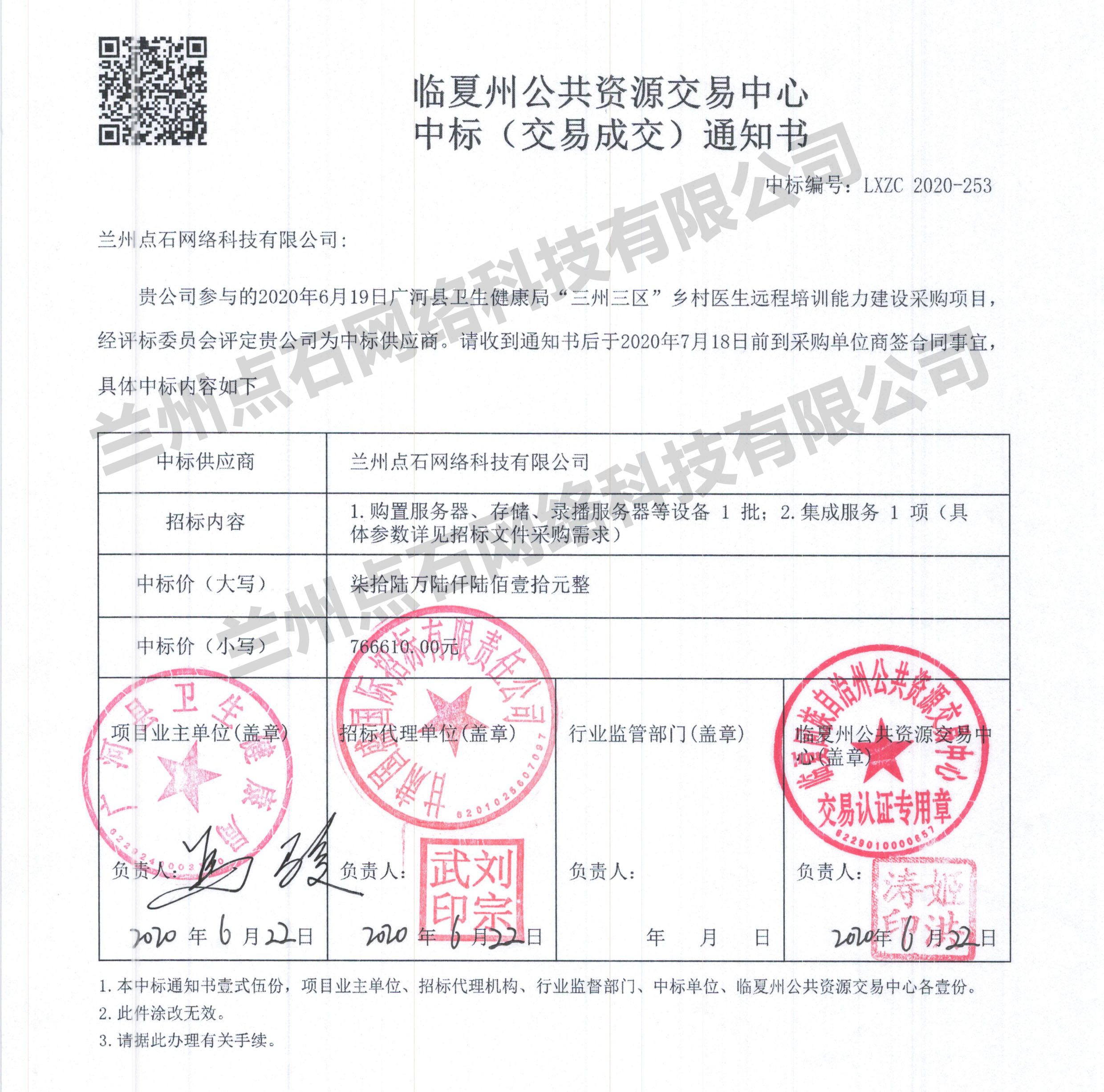 蘭州點石網(wǎng)絡(luò)科技有限公司近日捷報頻傳,繼2020年6月17日中標(biāo)永靖縣醫(yī)療衛(wèi)生“一站式”服務(wù)和區(qū)域遠(yuǎn)程醫(yī)療中心建設(shè)項目后,一鼓作氣,乘勝追擊,憑借良好的公司信譽(yù)和可靠的技術(shù)力量,成功中標(biāo)廣河縣衛(wèi)生健康局“三州三區(qū)”鄉(xiāng)村醫(yī)生遠(yuǎn)程培訓(xùn)能力建設(shè)采購項目。
