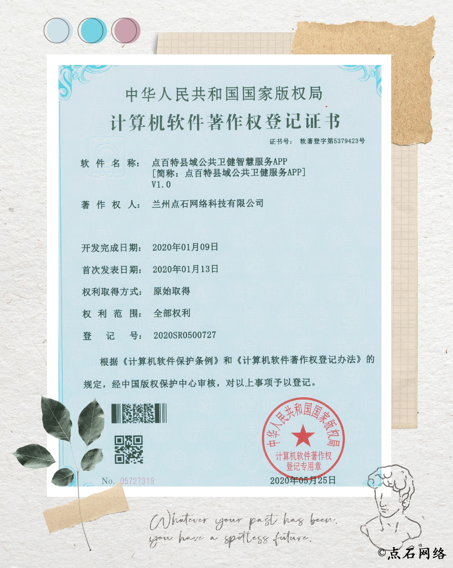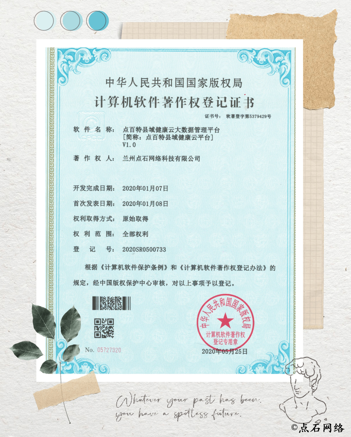 近日,由我公司自主設(shè)計(jì)與研發(fā)的兩項(xiàng)軟件產(chǎn)品:點(diǎn)百特縣域公共衛(wèi)健智慧服務(wù)APP 和 點(diǎn)百特縣域健康云大數(shù)據(jù)管理平臺(tái),榮獲國(guó)家版權(quán)局計(jì)算機(jī)軟件著作權(quán)登記證書(shū)。